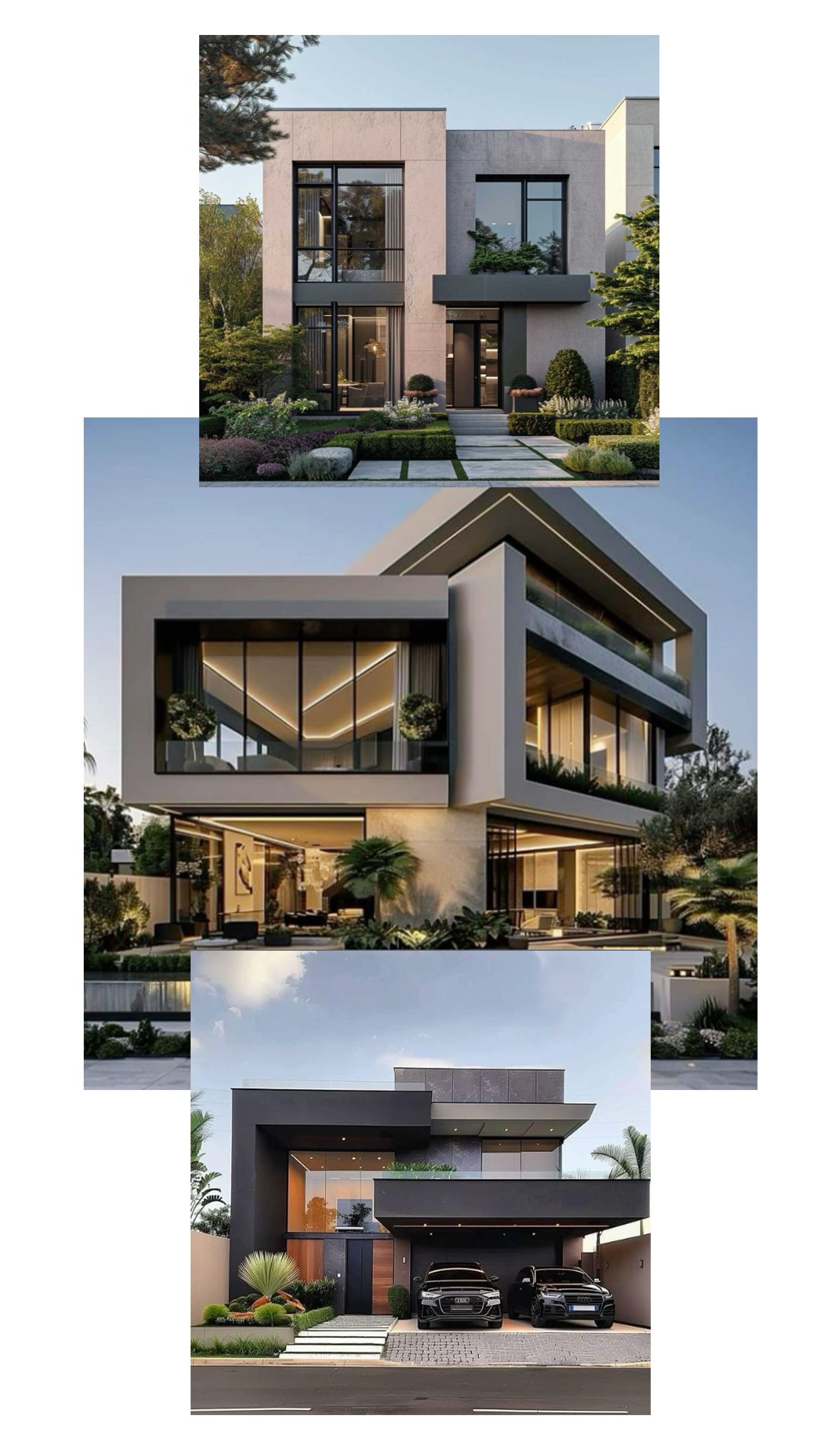 - Modern Facades: Sleek lines, glass accents, and neutral tones.